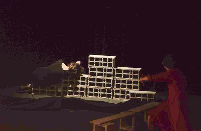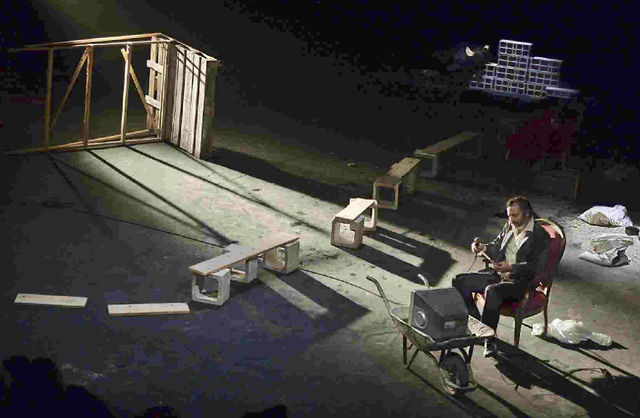 Le plateau est un chantier jonché de matériaux bruts - planches, sable répandu avec poussière et cailloux, palissade démontable, système de poulie qui amènent les acteurs à s'engager dans un combat avec ces éléments - reflet de l'âme humaine en morceaux mais qui ne cède pas. L'urgence et la nécessité de construire et déconstruire sans cesse pour exister, sont les bouées auxquelles se raccrochent ces personnages à la marge, vulnérables et parfois cruels.
